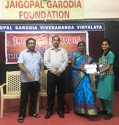 Jaigopal Garodia Vivekananda Vidyalaya School conducted a District Level English oratorical competition on, ‘Life as a Leader'. Hundred and ten participants from 78 schools took part in this event. T.S.Vyshnavi of std. XI-B secured the first place and won a cash award of Rs.2000.